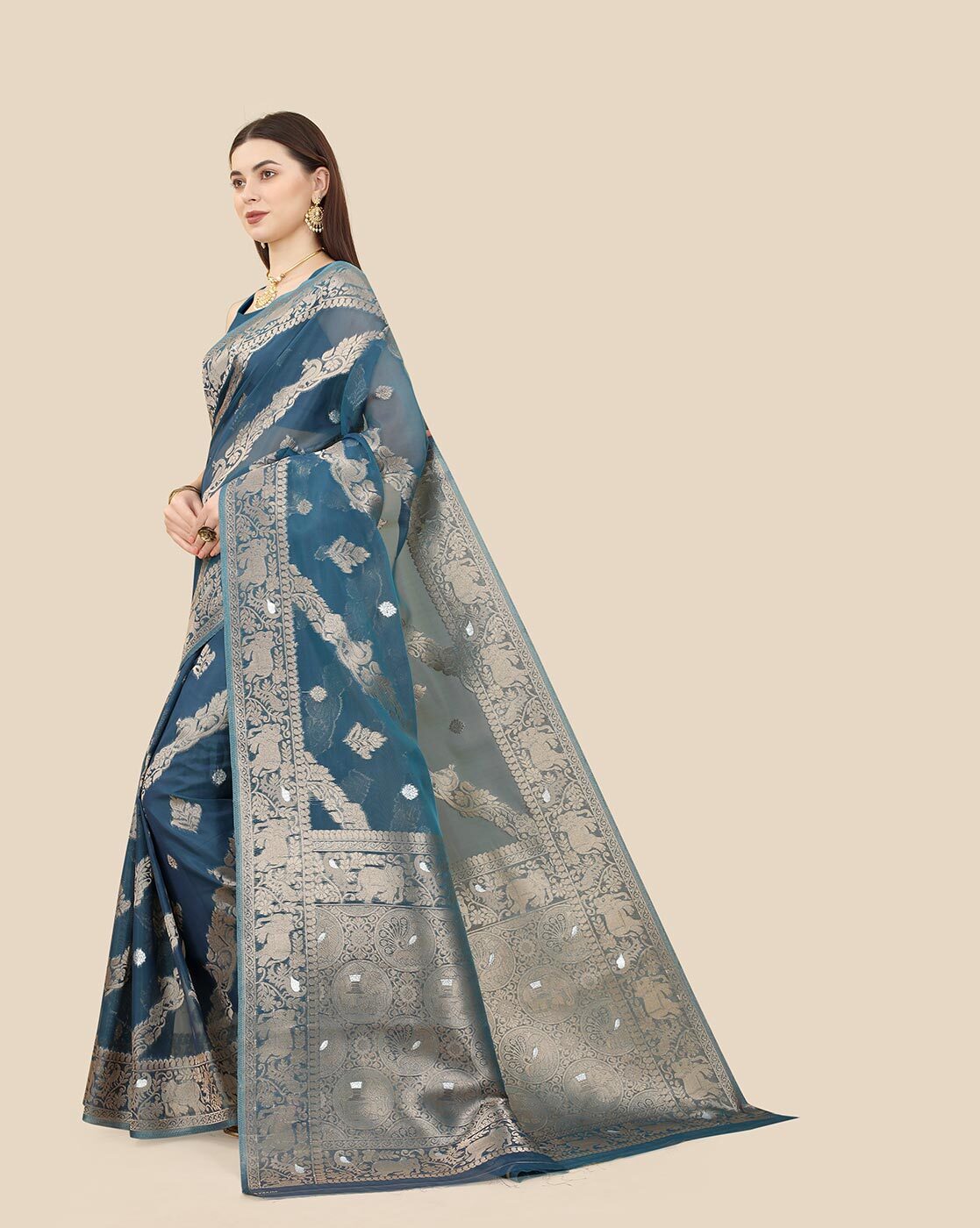 - The last image gives a detailed look of the blouse piece that comes with this saree (The model is wearing a blouse from our in-house wardrobe)