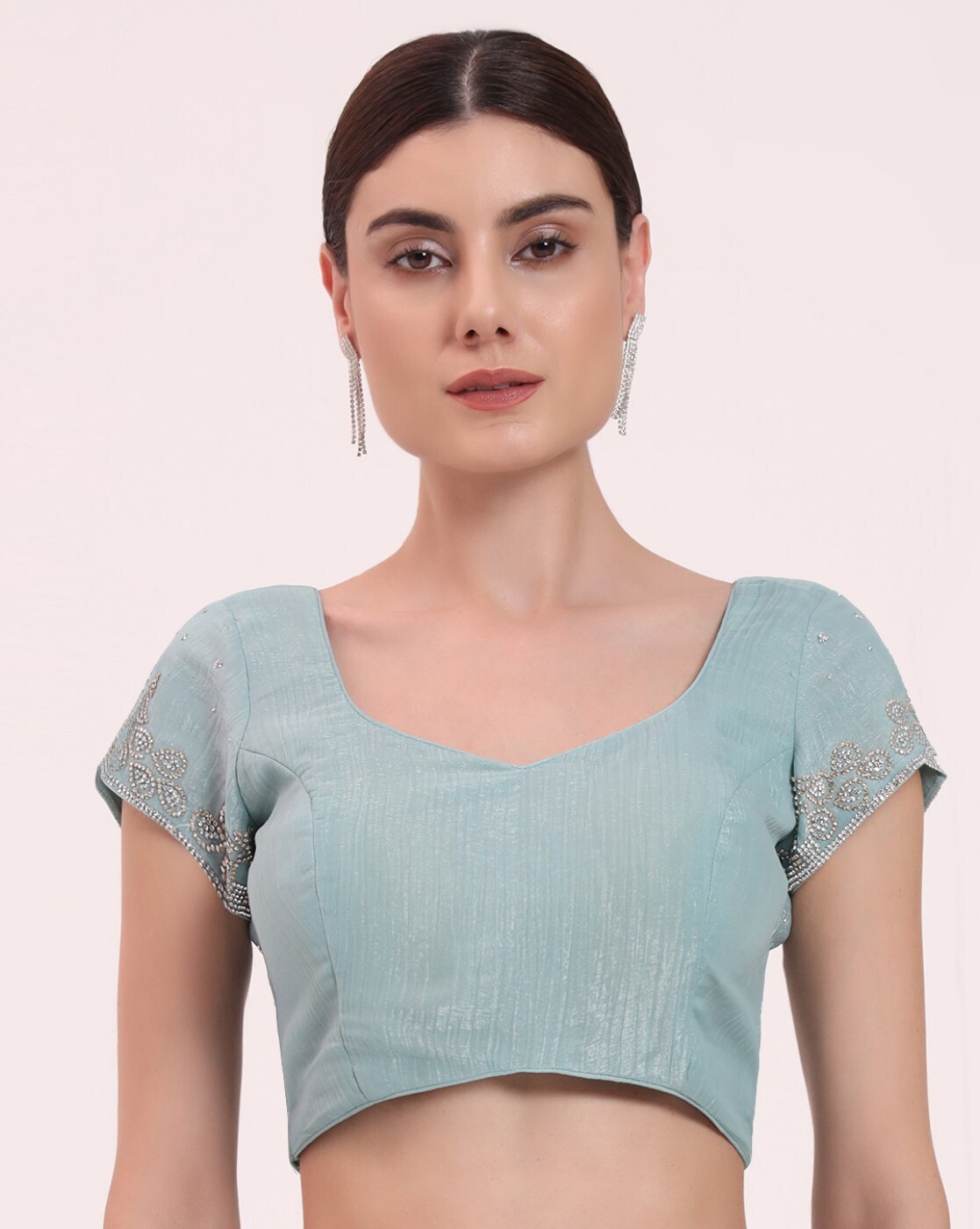 - The last image gives a detailed look of the blouse piece that comes with this saree (The model is wearing a blouse from our in-house wardrobe)