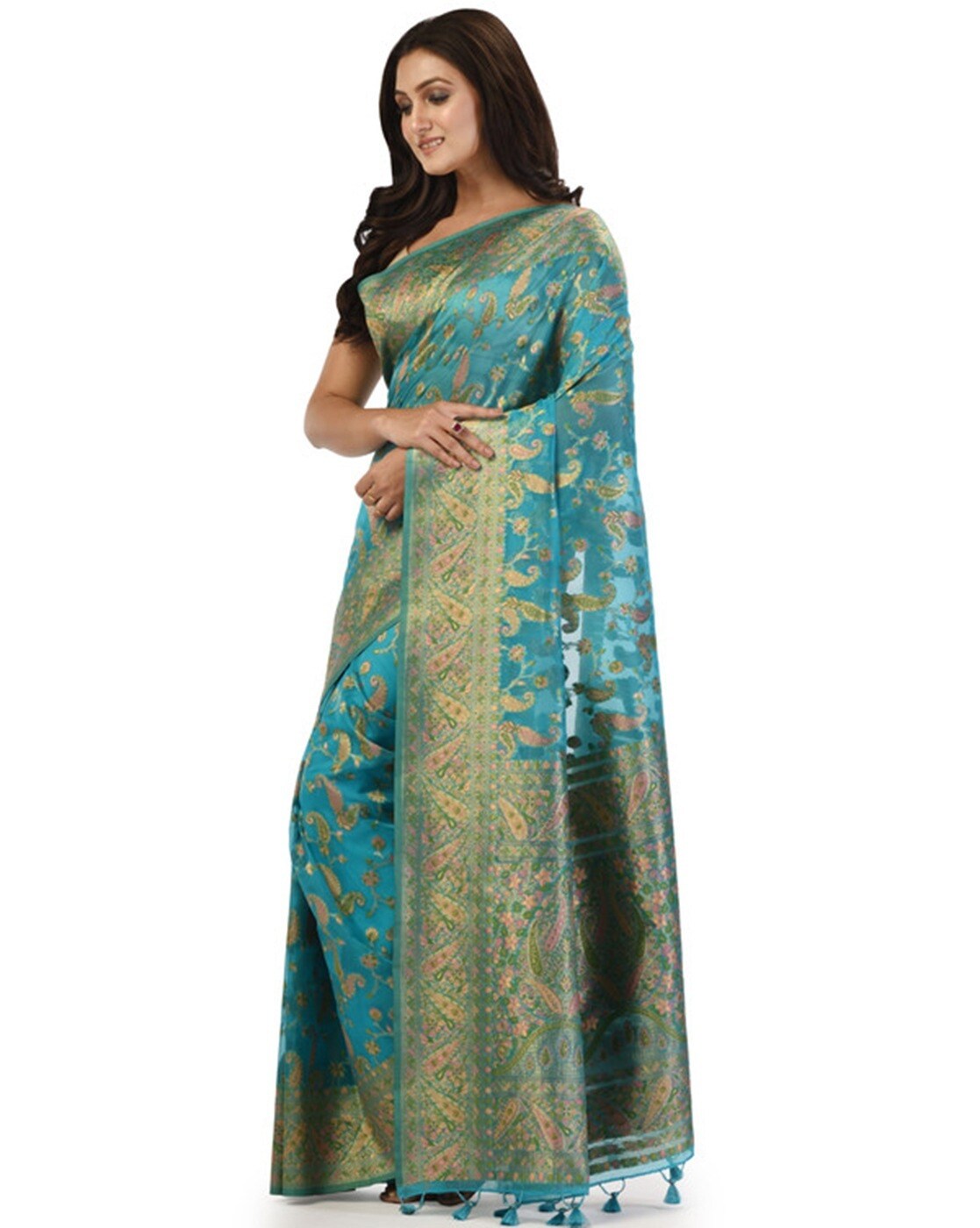 • The last image gives a detailed look of the blouse piece that comes with this saree (The model is wearing a blouse from our in-house wardrobe)