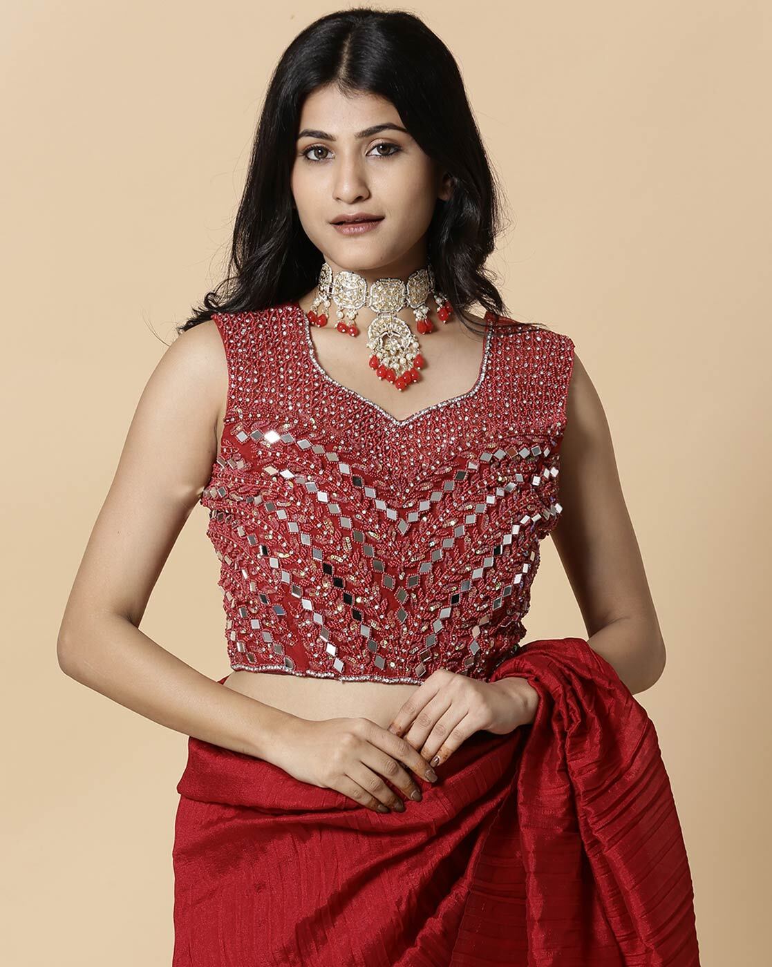 - The last image gives a detailed look of the blouse piece that comes with this saree (The model is wearing a blouse from our in-house wardrobe)