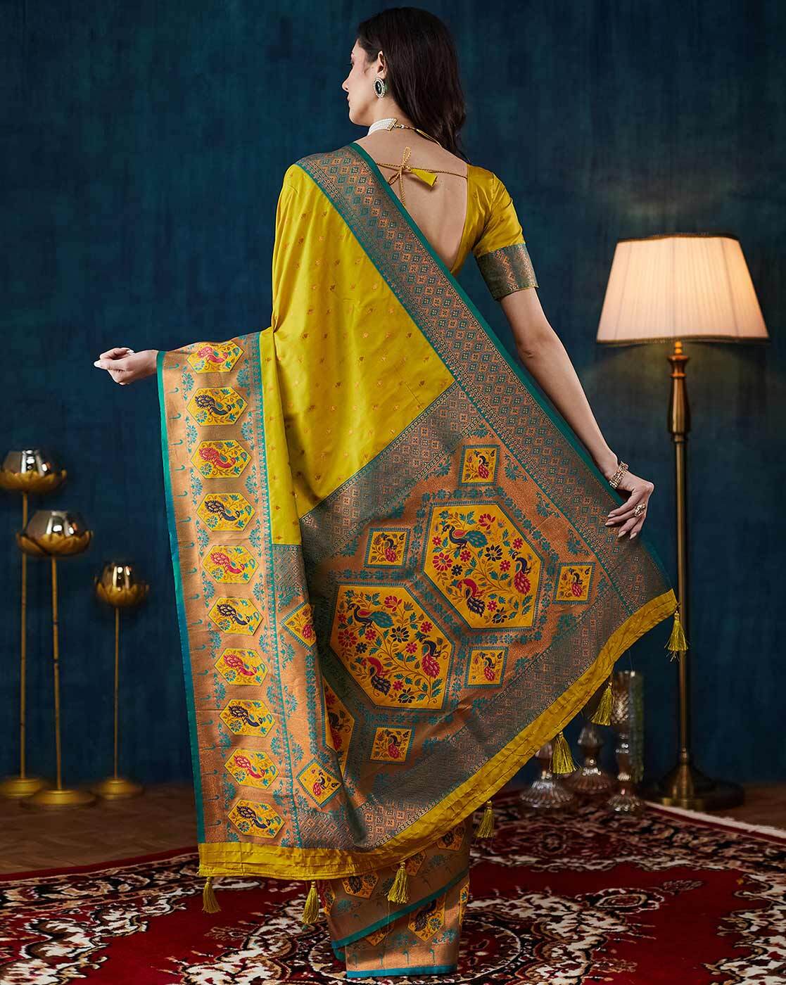 • The last image gives a detailed look of the blouse piece that comes with this saree (The model is wearing a blouse from our in-house wardrobe)